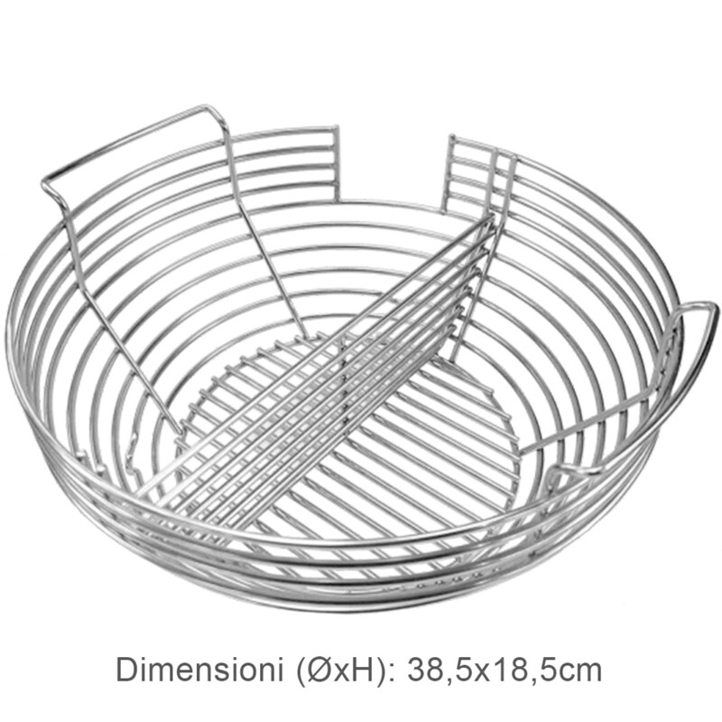 Il set viene fornito con un separatore adatto, in modo da poter riempire metà del cestello con carbone e, se lo si desidera, creare diverse zone di temperatura, perfettamente adatte ai tuoi piatti. Questo funziona particolarmente bene con la pietra deflettore divisa in due parti (disponibile opzionalmente). C'è anche un ampio incavo nel cestello per un facile utilizzo del binario del pellet per affumicare.