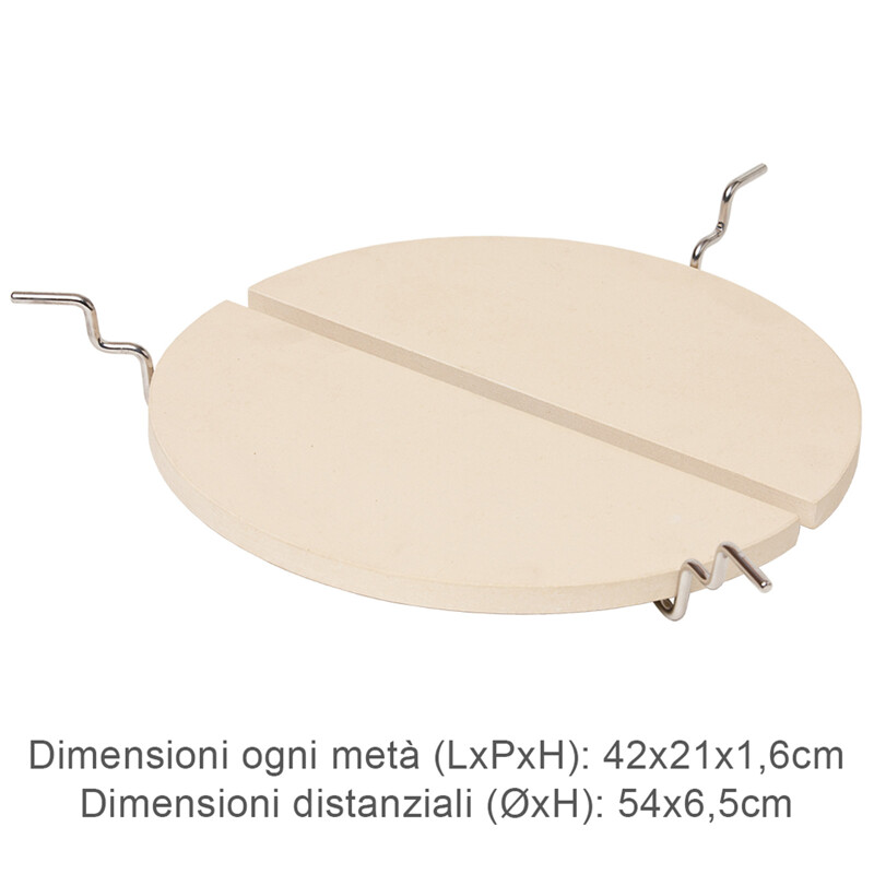 Dimensioni pietra deflettrice per metà (L x P x A): 42 x 21 x 1,6 cm Dimensioni distanziatore (diametro x A): 54 x 6,5 cm Peso: 4,45 kg Dati imballo LxL 45x45 cm (sacchetto a bolle d'aria) Peso con contenuto (per metà): 1,8 kg