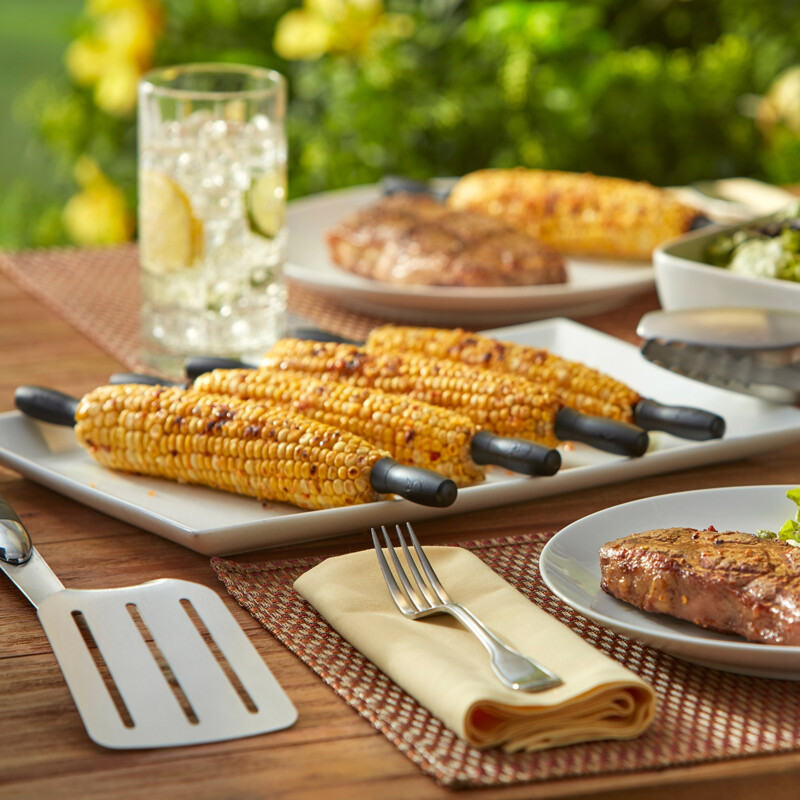 Il set per pannocchie include otto resistenti spiedini con impugnature in nylon per rendere facili da mordere le pannocchie imburrante.