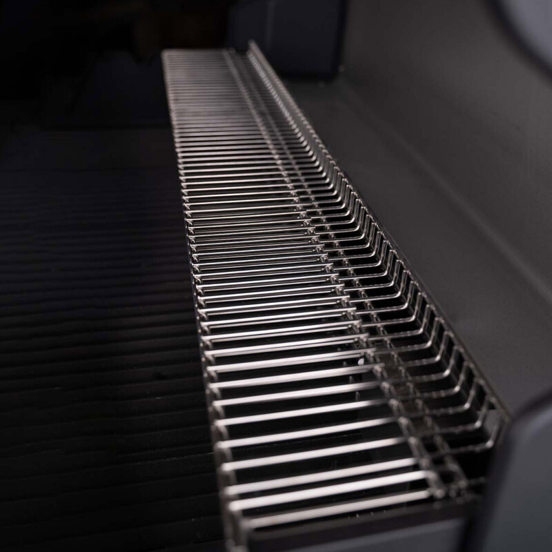 Il sistema di distribuzione del calore è ottimizzato, grazie alla presenza dei coprifiamma extra piatti che garantiscono una distribuzione uniforme del calore sotto la griglia e nella camera di cottura.