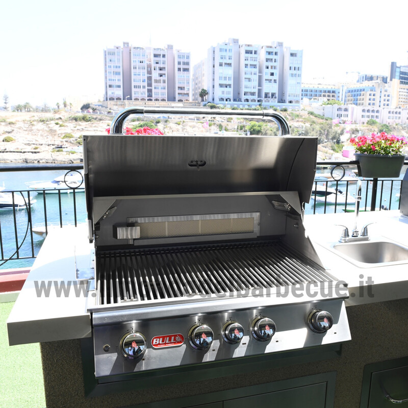 Barbecue interamente realizzato in acciaio inox AISI 304 spessore 2 mm, composto da 4 bruciatori in fusione di acciaio, griglie in acciaio, 1 bruciatore posteriore ad infrarossi e girarrosto con motore elettrico.