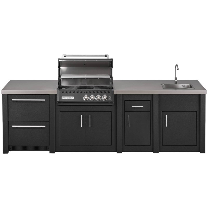 Moduli da cucina neri della serie Grandpro in alluminio con frigorifero, barbecue Crossray, mobiletto e lavello.