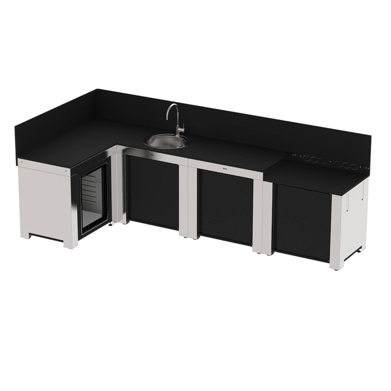 Pensato e concepito per chi desidera arredare i propri spazi esterni con una cucina da esterno comoda e funzionale, il set cucina Comfort a 4 moduli con angolo nero e acciaio inox è realizzato in acciaio inox marino e acciaio zincato verniciato a polvere per garantire una resistenza duratura alle intemperie, ai raggi UV e alla corrosione.