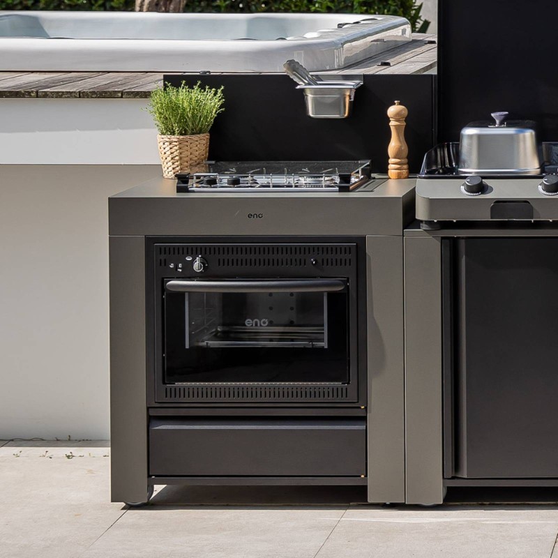 Grazie al Modulo di ENO, puoi goderti una cucina da esterno davvero su misura e perfettamente attrezzata. Il forno e i 2 fuochi a gas completano la plancha della tua cucina da esterno. L'apparecchio ti consentirà di diversificare i metodi di cottura. Grazie alla cottura al forno, prepara le tue carni, gratina, torte salate o torte.